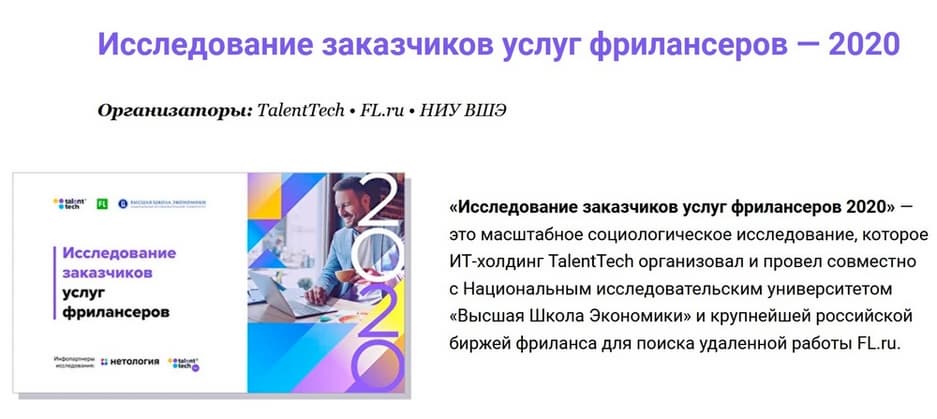 Аналитики российской биржи фриланса FL.ru, совместно с IT-холдингом TalentTech и НИУ ВШЭ определили профиль предпринимателей, которые пользуются услугами фрилансеров. Большинство из них – частные лица или ИП, часть из которых сами работают на фрилансе (32%), при этом 23% отметили, что привлечение фрилансеров – неотъемлемая часть их бизнес-модели. 24% заказчиков предпочитают узнавать статус задачи удаленно или по телефону, чтобы контролировать процесс. Главным мотивом сотрудничества заказчики назвали возможность привлекать на короткое время высококвалифицированных специалистов (66%). Главные клиенты фрилансеров — частные лица или ИП, на их долю приходится почти половина всего рынка – 45%.