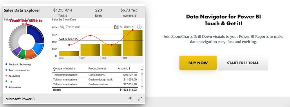 - Drill Down Visuals – решение ZoomCharts, которое ускоряет процесс внедрения Power BI и повышает качество принятых бизнес-решений, базирующихся на аналитике данных.