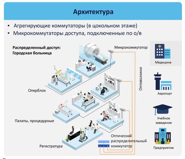 - Новые здания и техническое переоснащение. Иногда организации переходят к архитектуре FTTO из-за необходимости работать с приложениями, которые требуют расширения полосы пропускания. Обычно такие параметры определяются на этапе планирования и проектирования новых зданий, так как переход от медной кабельной инфраструктуры к оптоволоконной — это серьезное техническое переоснащение. Большим преимуществом в таком случае будет наличие в сети оборудования Cisco, что не только облегчит управление, которое будет осуществляться с единой системы управления Cisco DNA Center, но и позволит развернуть сетевую структуру Software-Defined Access.