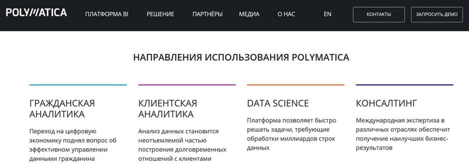 Платформа состоит из трех продуктов: Polymatica Dashboards, Polymatica Analytics и Polymatica ML.