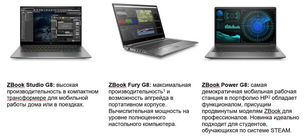 Компания HP Inc. представила новые модели ноутбуков HP ZBook Studio G8, ZBook Fury G8 и ZBook Power G8, предназначенные для творческих профессионалов и опытных пользователей, которым важна высокая производительность, максимальная надежность, возможность апгрейда и гибкость работы для выполнения задач из любой локации.