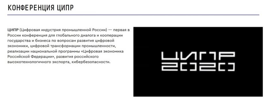 ЦИПР - это первая в России конференция, цель которой – диалог и кооперация государства и бизнеса по вопросам цифрового развития экономики, цифровой трансформации промышленности, российского высокотехнологичного экспорта, кибер- безопасности, а также реализации национальной программы «Цифровая экономика Российской Федерации». ЦИПР объединяет в себе бизнес-форум и выставочное пространство, где партнеры конференции представляют новые разработки и концептуальные решения. На сегодняшний день это крупнейшая конференция подобного формата. Так, в ней приняло участие порядка 4000 человек, в том числе видные представители политики и бизнеса: заместитель председателя правительства РФ Чернышенко Д.Н., министр Цифрового развития, связи и массовой коммуникации Шадаев М.И., генеральный директор компании Ростех Чемезов С.В., генеральный директор компании Росатом Лихачев А.Е. и многие другие.