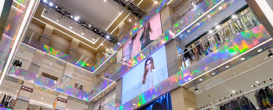 LED дисплеи LG LSBA025-GD располагаются в центральной части ЦУМа – в Атриуме (каждый экран диагональю 230" состоит из 60 кабинетов 500х500мм, всего в проекте было использовано 180 светодиодных кабинетов, и основная их задача – проинформировать посетителя о новых коллекциях модных брендов. Благодаря яркости 1000 Нит, шагу пикселя 2,5 мм и частоте обновления 3840 Гц обеспечиваются насыщенные цвета с контрастностью 8000:1. Модульная конструкция позволяет гибко подойти к потребностям заказчика и составить нужный по размеру LED дисплей.