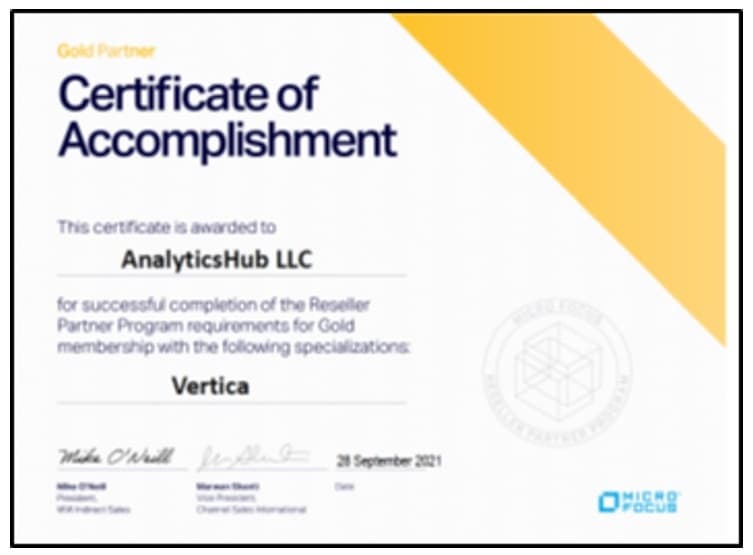 Присваивая партнёрам один из наивысших статусов, Vertica уделяет большое внимание выполнению ряда обязательных условий, включая техническую сертификацию их сотрудников. Статус Vertica Gold Partner свидетельствует о высоком уровне компетенции сотрудников AnalyticsHub в области аналитики больших данных.