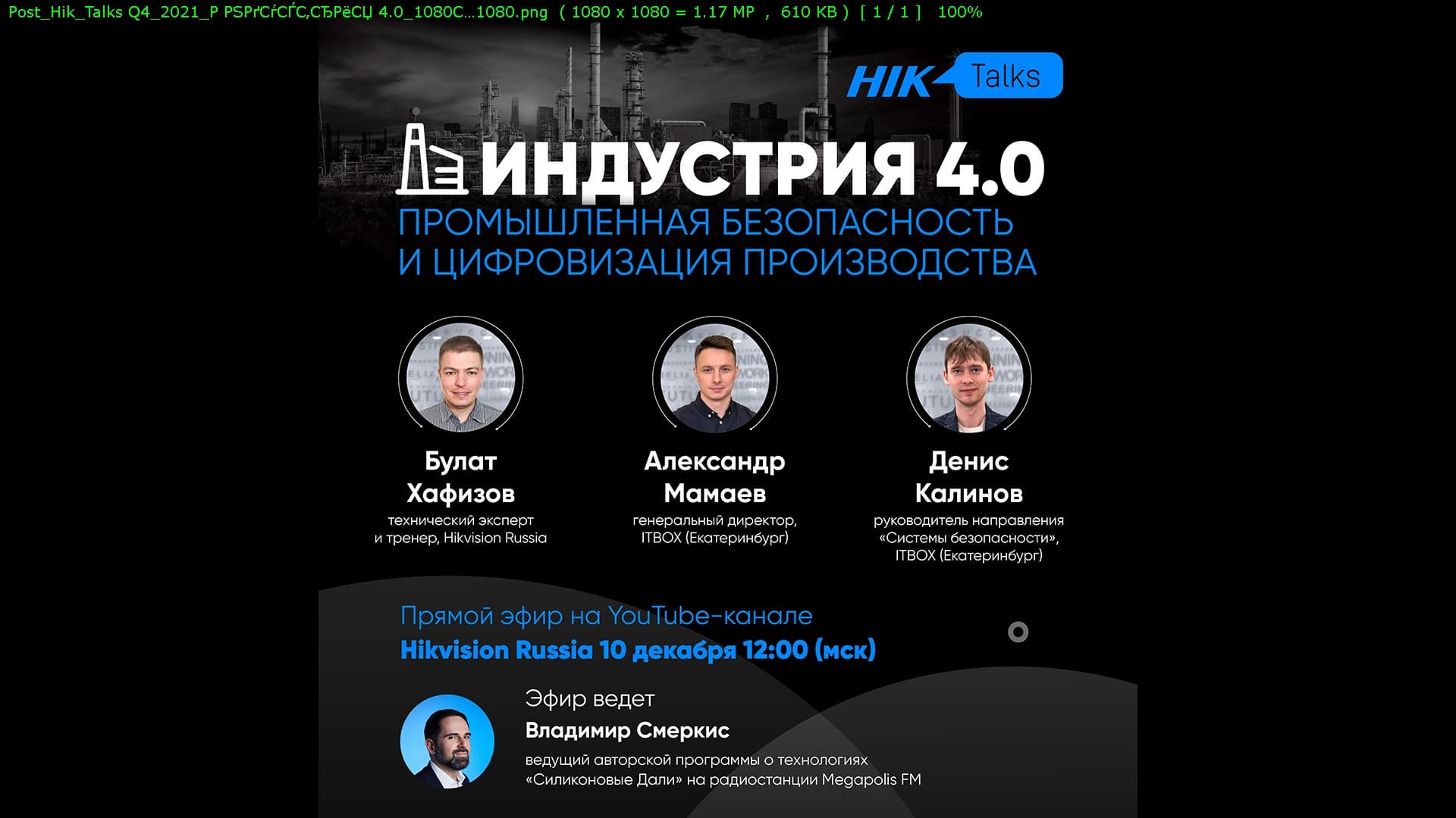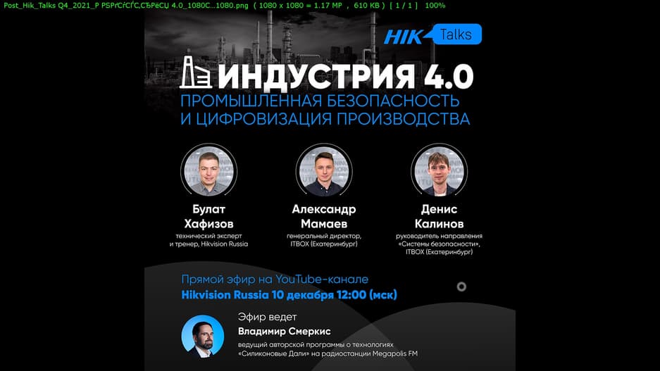В эту пятницу, 10 декабря на YouTube-канале компании Hikvision состоялся прямой эфир HikTalks, (https://www.youtube.com/watch?v=LhksHfEStNg) посвященный вопросам промышленной безопасности, развитию цифровых технологий для производственных площадок, проблемам, с которыми сталкиваются промышленные объекты при модернизации ИТ-инфраструктуры и систем безопасности.