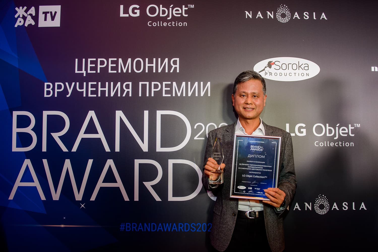 Флагманская линейка LG Objet Collection стала лауреатом премии Brand Awards 2021 в номинации «Бренд года» за «Линейку персонализированных холодильников со сменными цветовыми панелями». В Москве в ресторане Backstage состоялась торжественная церемония вручения наград. Ведущими вечера стали Юлия Барановская, посол добрых дел LG, теле- и радиоведущая, и телеведущий Костя Bravo.