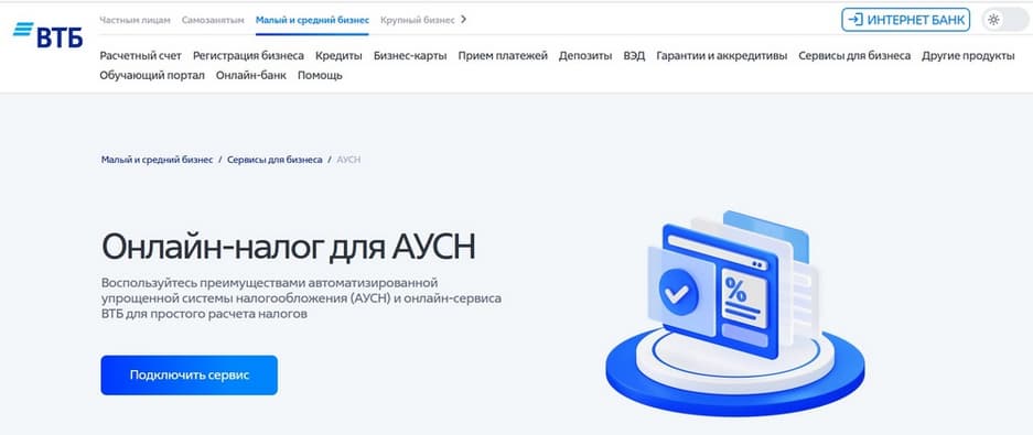 С помощью сервиса «Онлайн-налог для АУСН» клиенты ВТБ могут подать заявку в ФНС на переход на АУСН, отслеживать и оплачивать налоги, задолженности и пени. Он также позволяет автоматически рассчитывать и оплачивать НДФЛ за сотрудников. Вся информация отображается в личном кабинете клиента в интернет-банке ВТБ Бизнес.