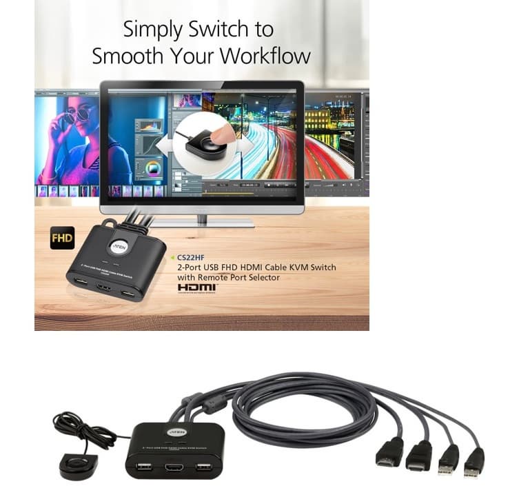 CS22HF поможет расширить рабочее пространство, создать настольную консоль, оснащенную клавиатурой/мышью/монитором для управления двумя компьютерами по соединениям USB и HDMI.