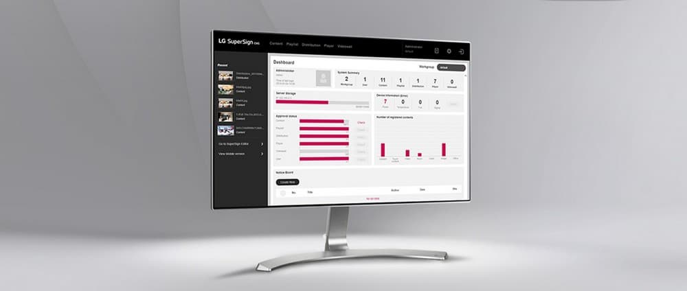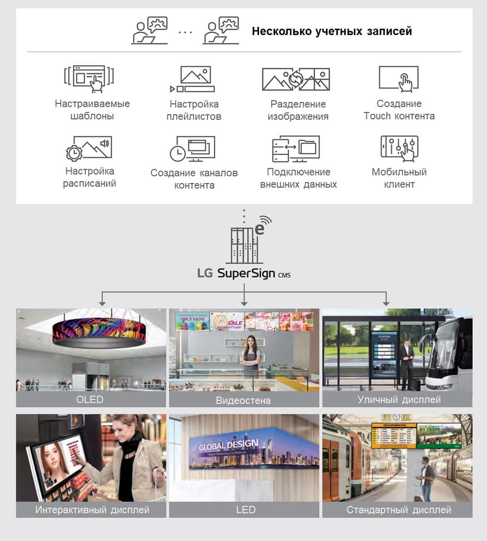 Бизнесу для выполнения своих коммуникационных задач требуется объединённая в единую разветвлённая система дисплеев, расположенных удалённо друг от друга. Управление этими дисплеями осуществляется при помощи выделенного персонального компьютера - сервера LG SuperSign CMS, который при помощи специального программного обеспечения осуществляет трансляцию комбинированного или интерактивного контента, а также обеспечивает мониторинг дисплеев. LG SuperSign CMS - комплексное программное обеспечение с функциями создания и управления аудио-видео материалами и их отображения, оптимизированное для профессиональных дисплеев LG. Данное программное обеспечение поддерживает до 1000 дисплеев и множество учетных записей, может быть связано с внешними базами данных и обеспечивает доступ к серверу с мобильных устройств. Благодаря простому и интуитивно понятному интерфейсу и параметрам шаблонов LG SuperSign CMS повышает эффективность создания и редактирования контента, а также его распространения. Пользователи могут легко настроить параметры яркости и громкости, чтобы задавать заранее определенное расписание, создавать синхронизированный контент для видеостен, а также многоканальный контент, который обеспечивает простое и быстрое переключение аудио-видео материалов на месте с помощью пульта ДУ.