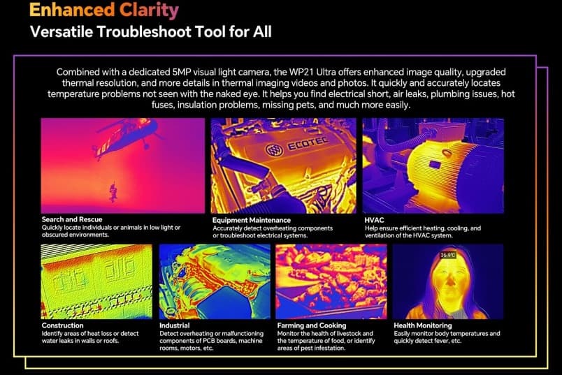 В сочетании со специальной 5-мегапиксельной камерой видимого диапазона WP21 Ultra обеспечивает более высокое качество изображения, более высокое тепловое разрешение и более подробные тепловые видео и фотографии. Он быстро и точно определяет проблемы с температурой, невидимые невооруженным глазом. Это может помочь вам найти короткие замыкания, утечки воздуха, проблемы с сантехникой, термопредохранители, проблемы с изоляцией, потерянные домашние животные и многое другое.