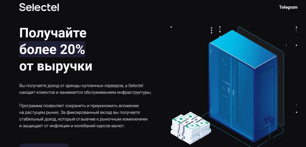 Участники программы могут приобрести фиксированные конфигурации выделенных серверов — оборудования, которое используется клиентами Selectel для размещения приложений, веб-сайтов, баз данных и выполнения других ресурсоемких задач. Стоимость доступных к покупке конфигураций начинается от 825 000 рублей. Доход участника программы формируется из выручки, полученной от сдачи серверов в аренду. При этом ему не нужно заботиться о поиске клиентов и обслуживании оборудования — этим занимается Selectel.