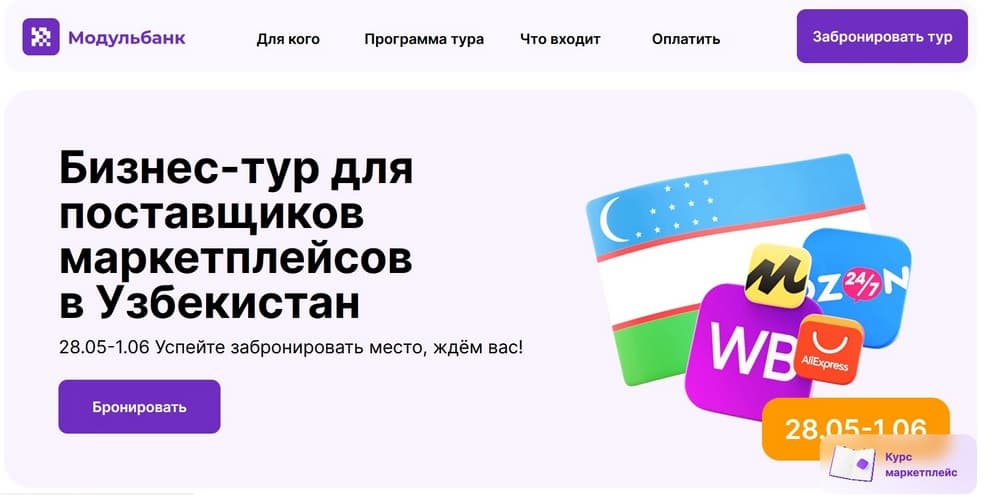 Команда Модульбанка впервые организует выездной тур в Узбекистан для начинающих и опытных продавцов на маркетплейсах. Мероприятие пройдет с 28 мая по 1 июня и даст селлерам возможность лично посетить производства, познакомиться с поставщиками, найти перспективные эксклюзивные товары и выгодные варианты доставки, а также возможность получить реальную информацию о том, как работать в этой стране, которую не найти в открытых источниках.