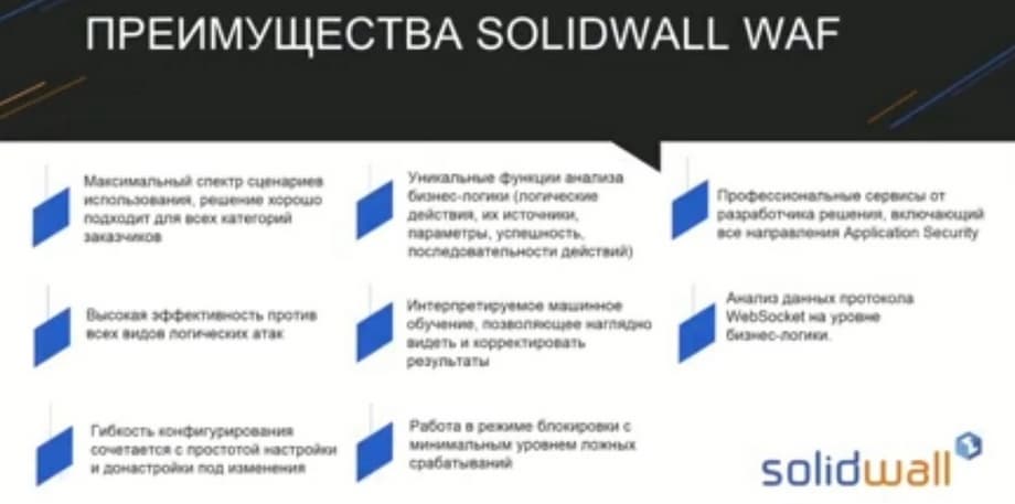 Наши продукты это SolidWall WAF - безусловный флагман, SolidWall DAST - сканнер защищенности, который мы выводим на рынок. Также выводится на рынок решение по on-line обучению "Практика защищенной разработки". И это далеко не все. Есть еще целый ряд, связанных друг с другом решений для анализа защищенности приложений, для обеспечения защиты в процессе эксплуатации web-приложений. И в этом направлении мы продолжаем активно развиваться.