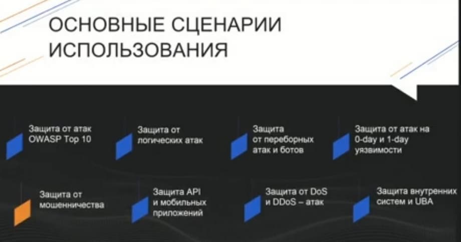 Основные сценарии, которые мы используем, это типовые атаки, атаки ботов, OWASP top 10, логические, zero-day, one-day атаки, защита от ботов, от мошенничества, защита мобильных приложений. Упомянем отдельно защиту от DOS и DDOS атак. Когда речь идет о массовой атаке с огромным количеством http запросов, пусть и простых, но массовых, например, распределенных атаках, то в этом случае, при столкновении с такими атаками, нужен реальный типовой продукт anti DDOS. И мы настоятельно рекомендуем перед WAF ставить решения класса anti DDOS. Но есть атаки, которые, проходя через фильтр грубой очистки, которым является anti DDOS, с точки зрения защиты web-приложений, могут через нее пройти. Например, атаки, направленные на исчерпание неких ресурсов web-приложения. В частности, если запустить несколько запросов, которые будут сравнивать не одно-два предложения продуктов, например товаров на сайте интернет-магазина, а 1000 или 2000. Такие запросы пройдут через anti DDOS потому, что они не массовые, но при этом могут перегрузить вычислительные мощности самого web-приложения. И вот защита от таких атак умного DOS на уровне L7 является спецификой нашего решения, спецификой Web Application Firewall.