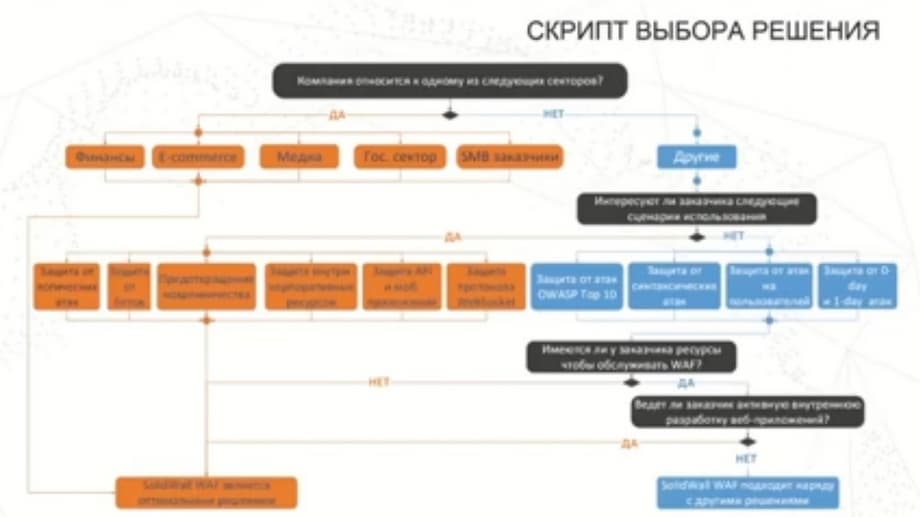 Теперь давайте разберемся, какой скрипт нужен для выбора этого решения. Посмотрим по секторам. На слайде слева: Финансы, Медиа, Госсектор и заказчики. Это то, что мы активно умеем защищать. И не просто защищать. В каждом из этих секторов у нас есть клиенты, давно и успешно пользующиеся нашим продуктом, и обратная связь от них позволяет развивать наши решении в том направлении, чтобы специфика набора угроз, с которыми сталкиваются эти организации, учитывалась в нашем продукте, и чтобы этим угрозам клиенты могли успешно противостоять. Понятно, что угрозы эти разные. В E-commerce есть угроза попытки скрапинга, т.е. определения информации с помощью бота ценных предложений, интересных для конкурентов, или попытка подобрать промо-код или какие-то еще данные, которые позволят произвести некие финансовые транзакции, выгодные для злоумышленников. В каждом секторе есть своя специфика угроз, и мы ее всегда учитываем. Сюда можно еще добавить и промышленные организации, которые во многом государственные, и поэтому не выделены в отдельный сектор.