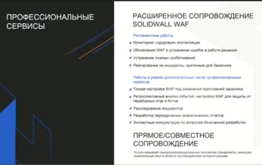 Про ресурсы обслуживания. Дело в том, что экспертиза, о которой я говорил выше, может быть доступна для заказчика в рамках сопровождения нашего продукта. Заказчик может выбрать любой набор сервисов начиная от базового сервис-деска (вопросы-ответы). Это в случае, если заказчик планирует самостоятельно работать с продуктом и если у него достаточная компетенция для этого, но просто иногда требуются консультации с нашими специалистами. И заканчивая вариантом, когда приложения защищаются нашими инженерами. Т.е. некий аутсорсинг, удаленный доступ, мониторинг. И при возникновении атак и инцидентов наши специалисты информируют заказчика, сами настраивают защиту, блокируют атаки, при изменении самих web-приложений донастраивают модифицируют наши правила защиты. А в результате атак дают рекомендации по тому, как можно защитить существующие приложения на уровне разработки, вплоть до того, что наши эксперты рекомендуют вносить некоторые изменения в web-приложения с тем, чтобы они сами по себе стали менее уязвимыми. И вся экспертиза, которая есть у нас, в рамках этих сервисов, становится доступной для заказчика.