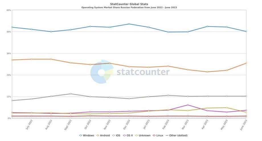 Согласно данным компании Statcounter, собирающую статистику по трафику в интернете без использования искусственных весовых коэффициентов, в июне 2023 года доля пользователей отечественных операционных систем на базе Linux составляет 2,1%, оставаясь таким же низким в отличие от лидирующих позиций Windows.