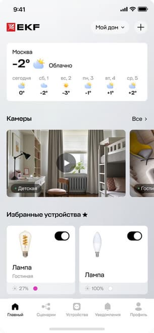 Пользователи нового приложения EKF Connect Home получат созданный с нуля красивый и удобный интерфейс. В полностью переработанном интерфейсе приложения более точный погодный виджет, подтягивающий данные из Яндекс Погоды.