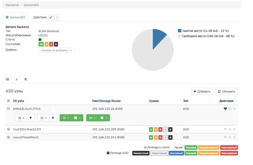 Basis SDS предлагает блочно-файловый интерфейс поверх пула дисков: традиционных твердотельных SSD, накопителей с интерфейсами NL-SATA и высокопроизводительных NVMe-накопителей.
