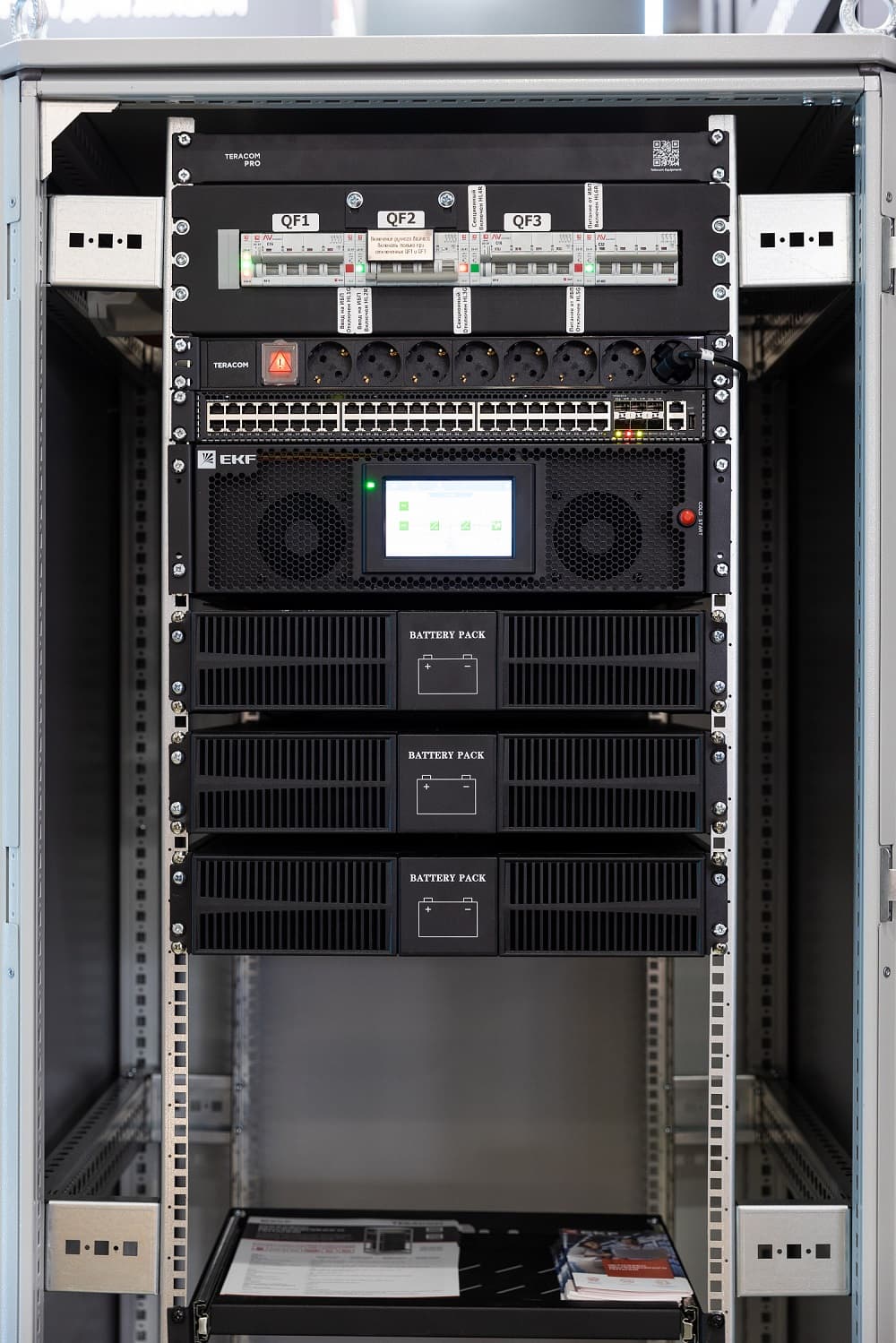 Решение выполнено на базе ИБП E-Power SW900pro-G5-RT 10–30 кВт и многофункциональной оболочки AleSta в формате серверного шкафа.