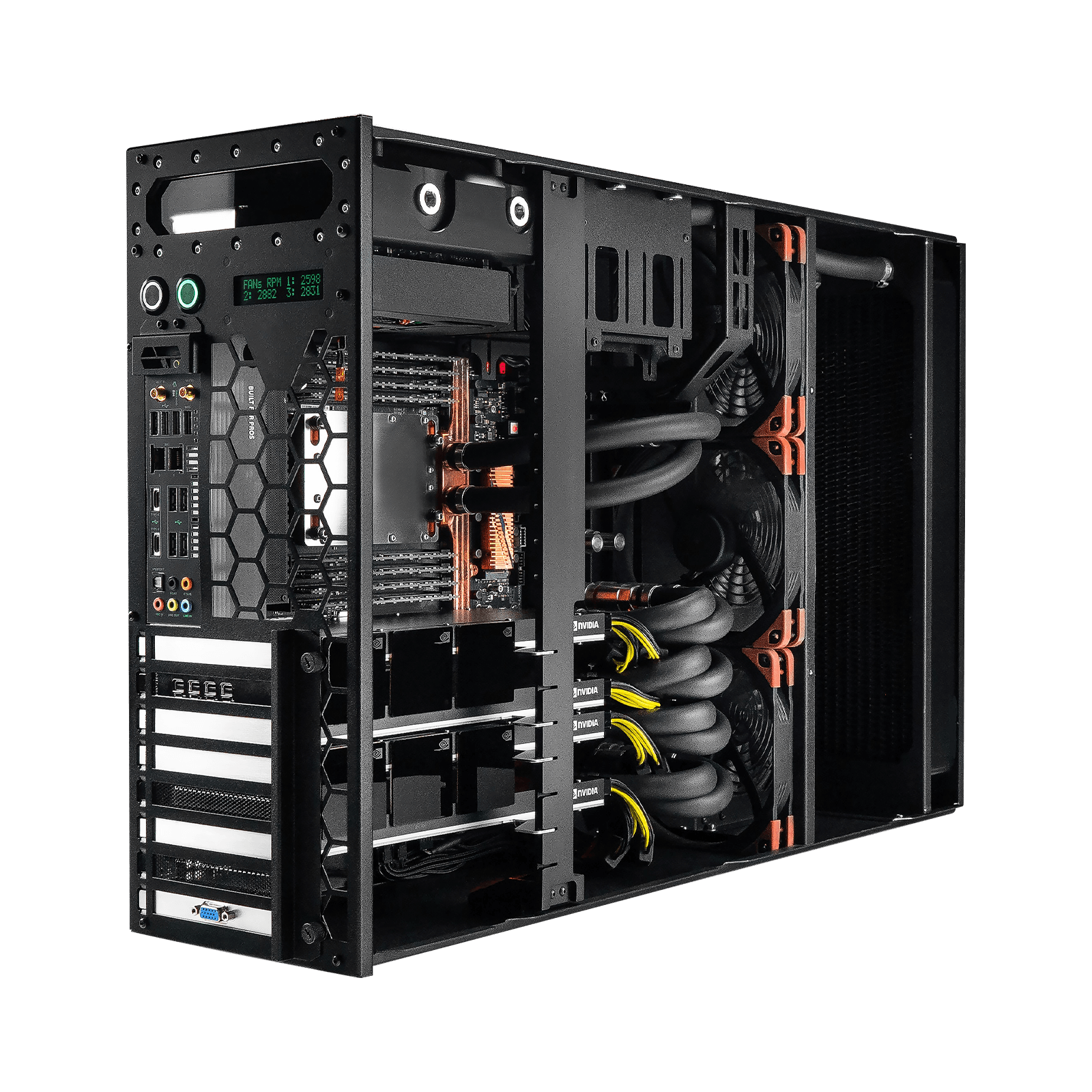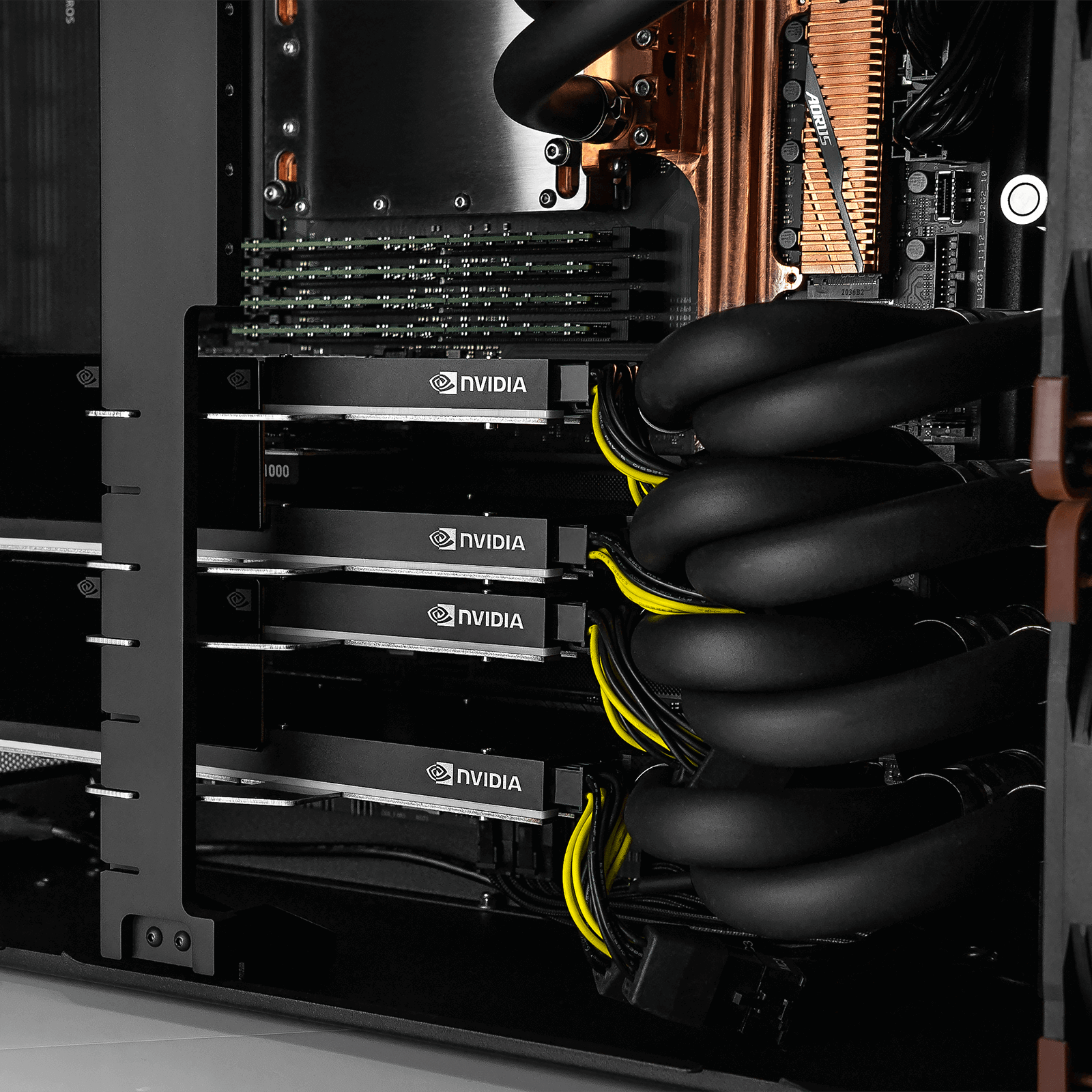 Станция поддерживает до четырех GPU. Она совместима с графическими процессорами NVIDIA 5090, RTX 6000 ADA, L40, L40S, H100, H200, RTX PRO 6000 и AMD W7800, W7900. Решение изначально спроектировано под жидкостное охлаждение.