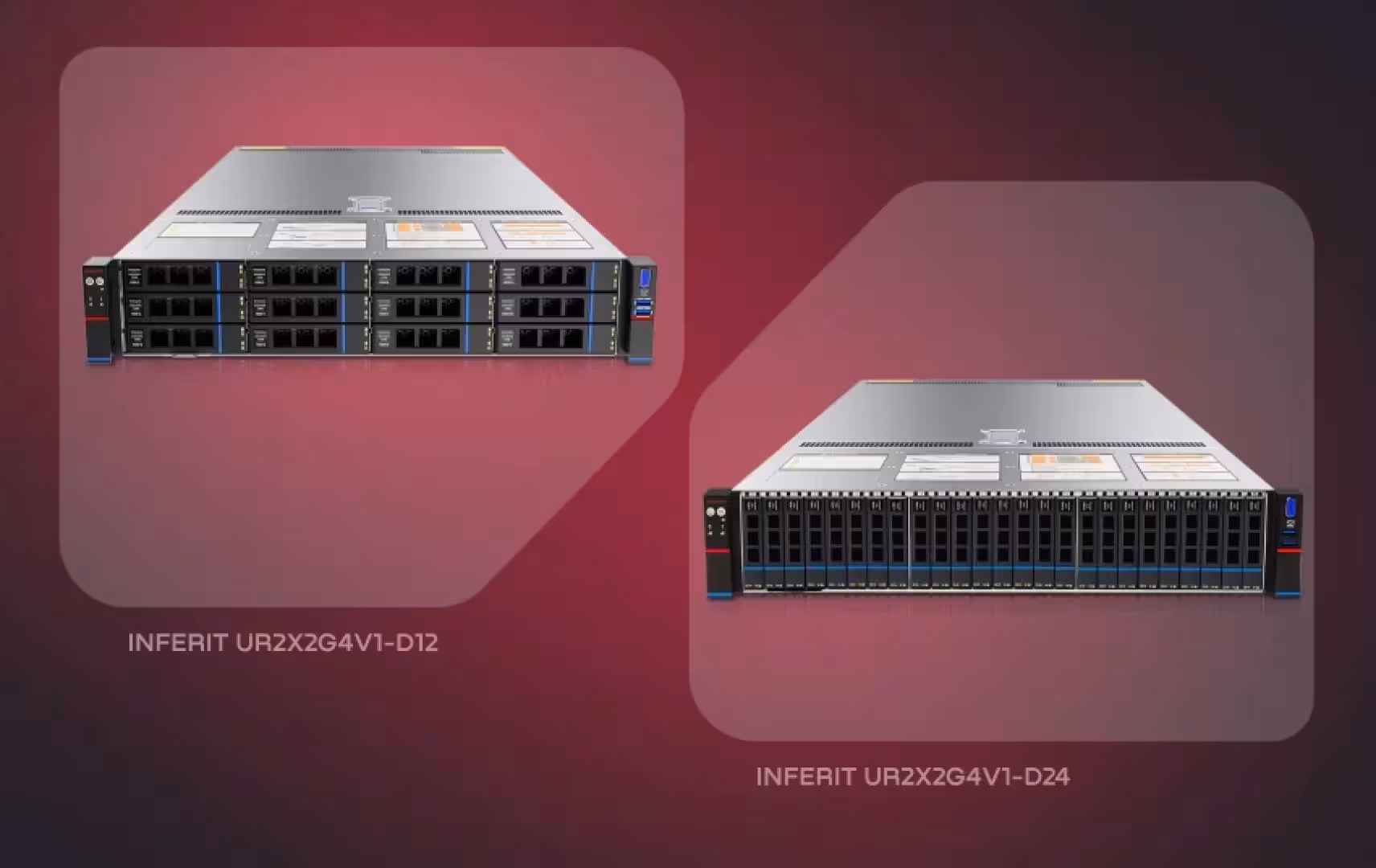 Inferit GR2X2G4V1-D12 — формат 2U, комплексные вычисления, виртуализация, облачные сервисы, развертывание языковых моделей, обучение искусственного интеллекта, 3D-визуализация и 3D-рендеринг, научное моделирование. До 128 вычислительных ядер двух процессоров Intel Xeon Scalable, до 8 ТБ оперативной памяти DDR5, до двух графических карт, два резервируемых блока питания мощностью 2 КВт, 12 слотов для накопителей.