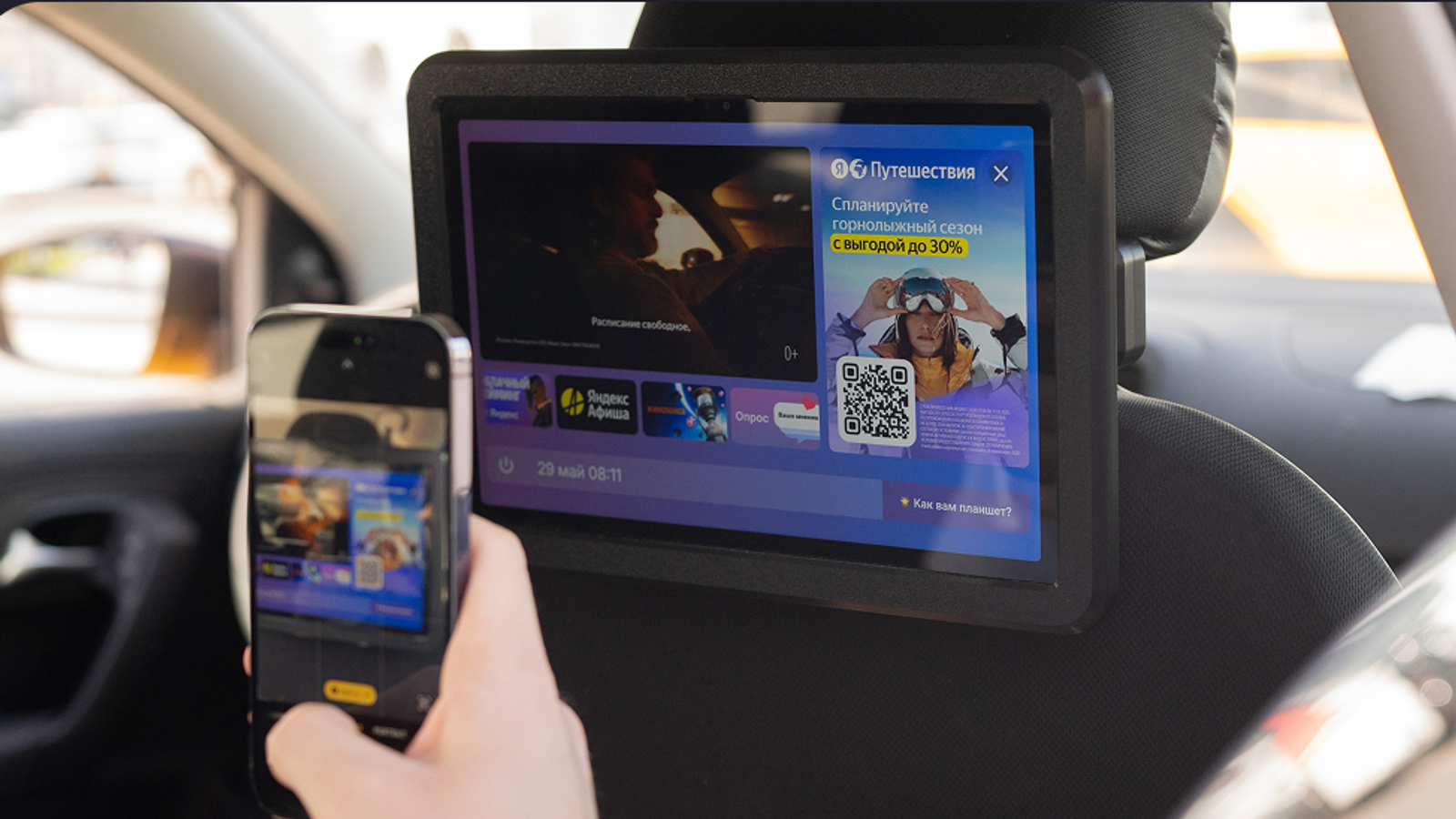 Как рассказали в Яндексе, пассажир такси может посмотреть на планшете сериал или мультфильм, поиграть в игры, а ещё ему покажут видеобаннер с рекламой. В видеобаннер можно добавить QR-код с ссылкой на сайт или товар на «Маркете», логотип, заголовок или подзаголовок.