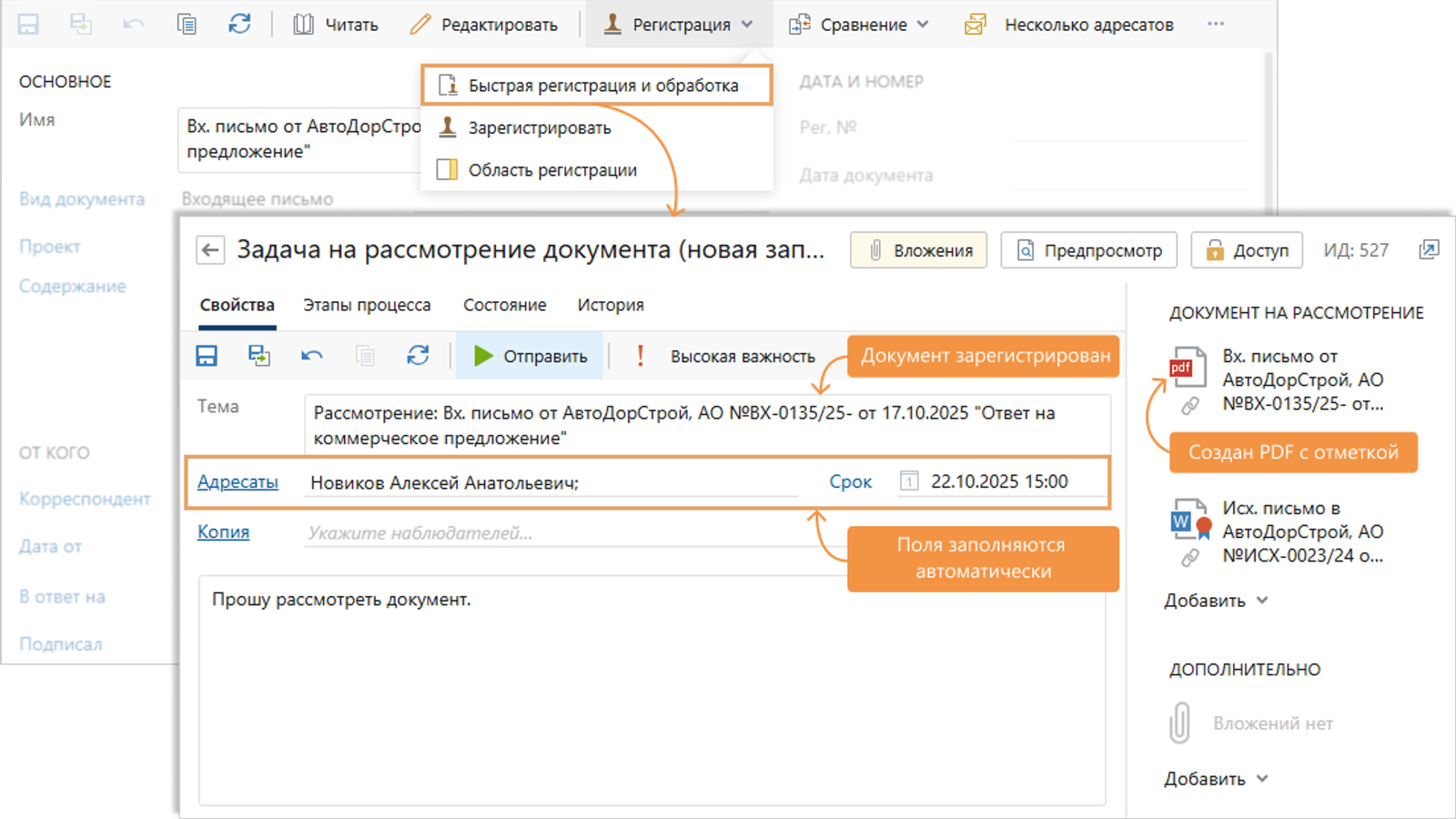 Обновления ускоряют обработку входящей корреспонденции: делопроизводитель может зарегистрировать документ, сформировать PDF с отметкой о поступлении и открыть карточку задачи одной кнопкой. Автоматическая регистрация сокращает время обработки входящей документации.