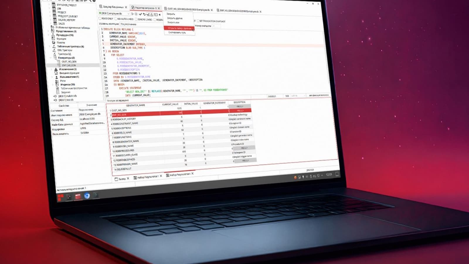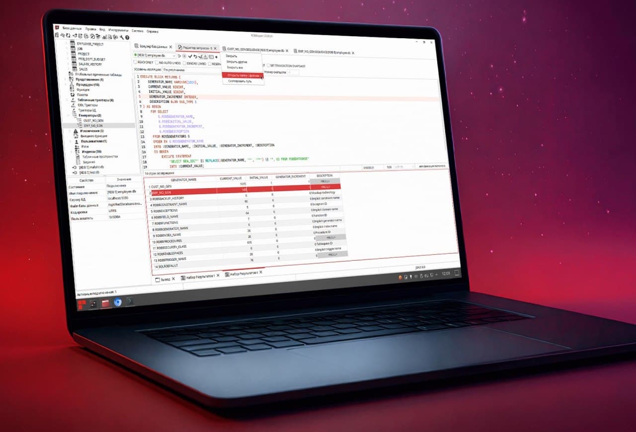В «РБД Эксперт» 2026.01 появилась новая система вкладок с обновленным дизайном и возможностью перестановки вкладок, стал возможен перезапуск генератора базы данных с начального значения, а также изменение текущего значения генератора базы данных, игнорирование пробельных символов при сравнении метаданных, втоматическое применение сохраненных настроек приложения после обновления и задержка при подтверждении удаления / пересоздания базы данных.