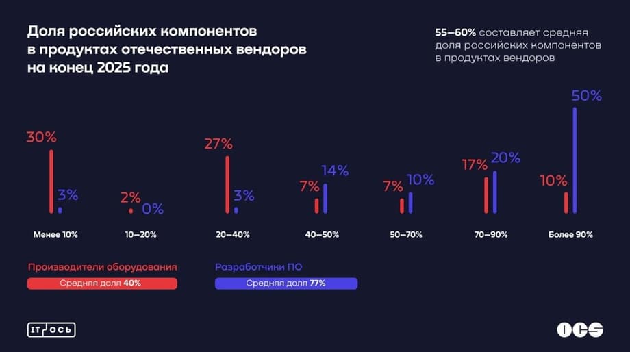 Осенью 2025 года компания OCS опросила более 100 российских вендоров — производителей ИТ-оборудования и разработчиков ПО. Исследование должно было ответить на вопрос, каких результатов добились российские производители «железа» и софта в локализации своих решений