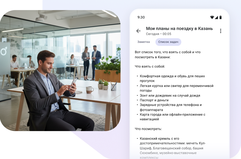 Пользователь записывает голосовое сообщение, а система автоматически преобразует его в текст с правильной орфографией и пунктуацией. Встроенный искусственный интеллект предлагает пять готовых шаблонов для преобразования текста: «Вывод», «Список задач», «Письмо», «Отчет о встрече» и «Пост». Также можно задать собственную инструкцию для преобразования.