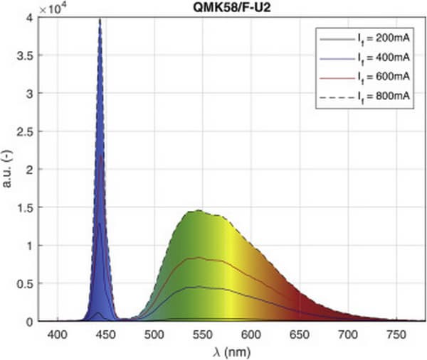 Спектр лазерно-фосфорного источника света. Синий явно выделяется на фоне всех остальных цветов