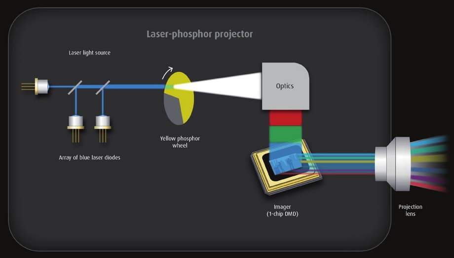 Еще одно явное и неоспоримое преимущество — высокая надежность и устойчивость к перегрузкам у лазерно-фосфорных источников света. Проще говоря, она не столь нежные, как лампы, и требуют меньше времени на охлаждение после выключения. Да и стартуют гораздо быстрее, чем лампы. За исключением трехлазерных аппаратов для коммерческих кинотеатров вроде IMAX. Источники света в недорогих проекторах, зовущихся просто лазерными, на деле состоят из сборки синих лазерных диодов и так называемого фосфорного колеса, в котором, если говорить корректно, используются многокомпонентные люминофоры.