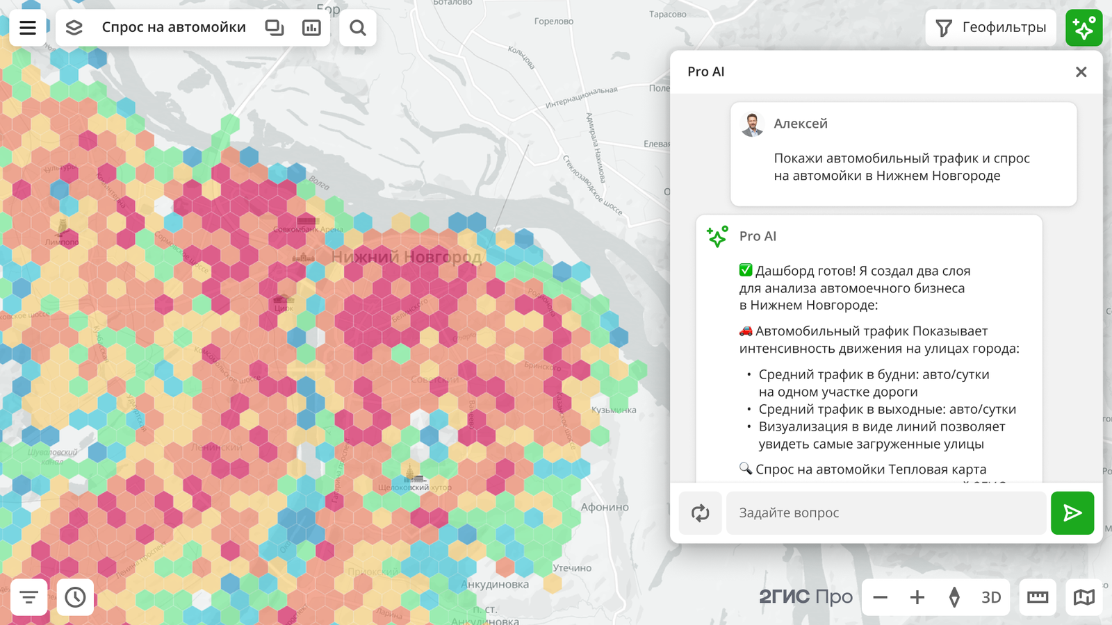 ИИ-ассистент понимает сложные запросы, учитывает контекст и формирует отчёты с информацией о городской среде, инфраструктуре, спросе, населённости и трафике. Он поддерживает многошаговые сценарии, позволяя уточнять запросы и добавлять новые параметры.