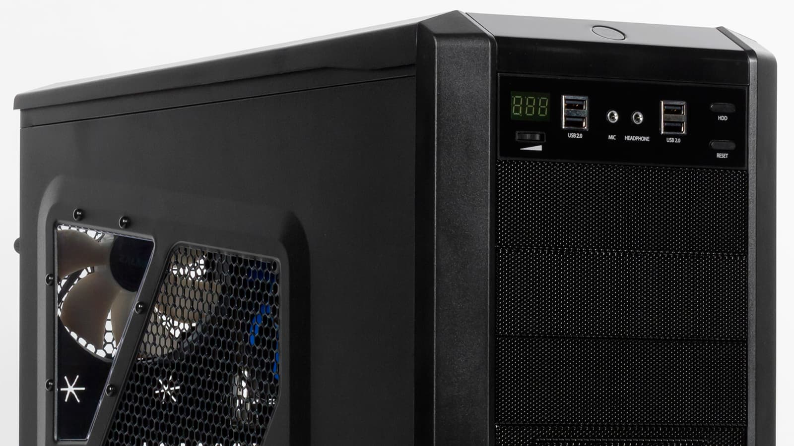 На фронтальную панель корпуса выведены кнопки питания и перезагрузки, четыре разъема портов USB 2.0 и два аудиоразъема типа mini-jack для подключения наушников и микрофона.