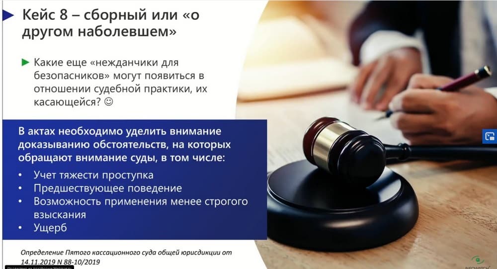 Где-то есть более продвинутые судьи, для них возможно будет понятна выгрузка лог файлов из тех или иных систем мониторинга, тем не менее следует очень подробно все фиксировать, тем вы увеличиваете вероятность победы в суде. Какие-то суды будут вникать в подробности, а какие-то скажут, что доказательства не относимые и не допустимые, есть примеры, когда исключаются скриншоты экранов из дела, есть примеры, когда исключаются технические экспертизы, проведенные после увольнения работника, когда экспертом анализировался его ноутбук и выяснялись случаи сливания информации на флэшку, суд эти доказательства не принимал во внимание.