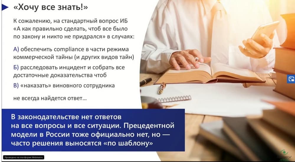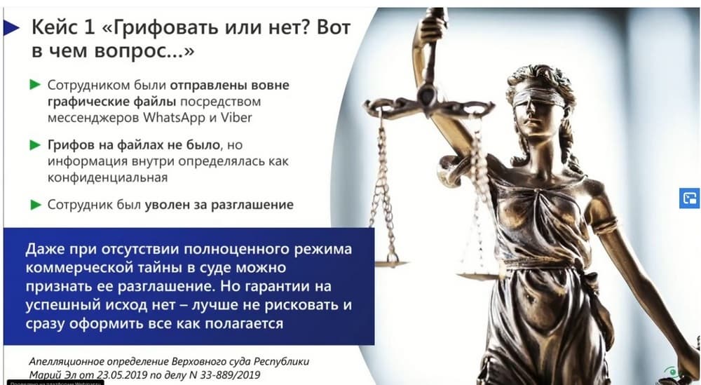 Слово взял юрист Сергей Хайрук. По его словам, это вопрос неоднозначный, он с одной стороны предполагает обязательное грифование, но с другой стороны в той же статье есть упоминание, что меры должны быть необходимыми и достаточными. Как раз суд и решает вопрос о необходимости и достаточности. Есть кейсы, в которых суд не считает, что режим коммерческой тайны был установлен и встает на сторону работника при увольнении и считает, что разглашения не было. И есть другая позиция, в которой суд встает на сторону работодателя и оценивает информацию исходя из определения, которое есть в законе о коммерческой тайне. Здесь опасность в том, что наши суды, к сожалению, решают дела по шаблону и подходят к своей деятельности довольно формально.