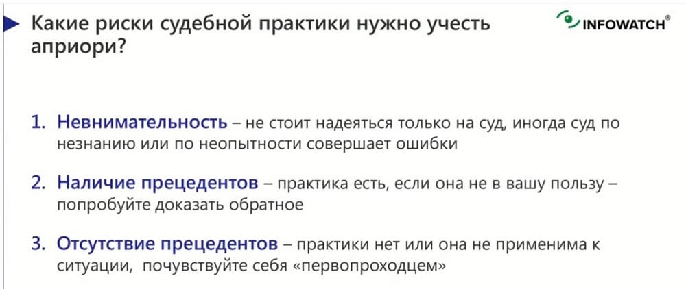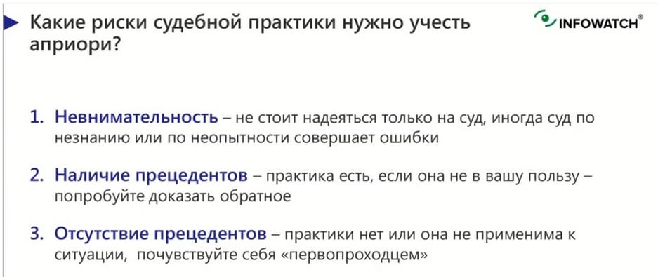 На следующем слайде приведены риски судебной практики, которые нужно учитывать априори.
