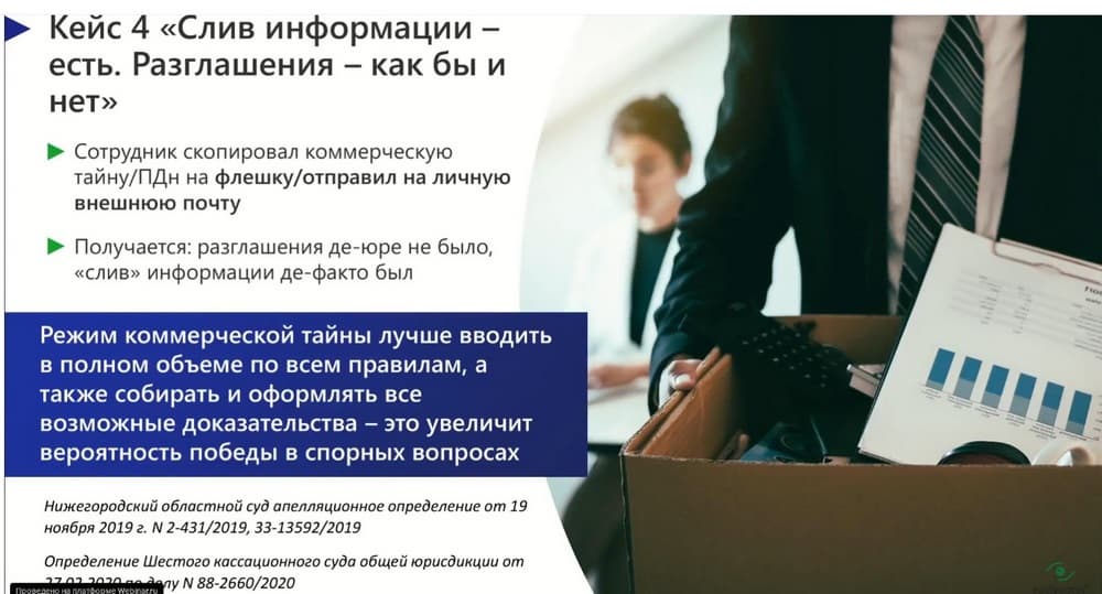 Но суд не согласился с этим, он написал, что информация была предана в распоряжение как минимум одного лица международной компании Viber, которая осуществила обработку этой информации и разместила ее на принадлежащих Viber серверах. Данная позиция прямо противоречит известному постановлению по делу Сушкова 2017 года 25-П, где разъясняется положение информационных посредников и суд указал, что данные информационные посредники обладателями информации не являются и в данном случае разглашения не получается. Данный кейс очень странно решен. Обычно они решаются в пользу сотрудника. На слайдах представлены ссылки на реальные дела, с ними можно ознакомиться позднее.