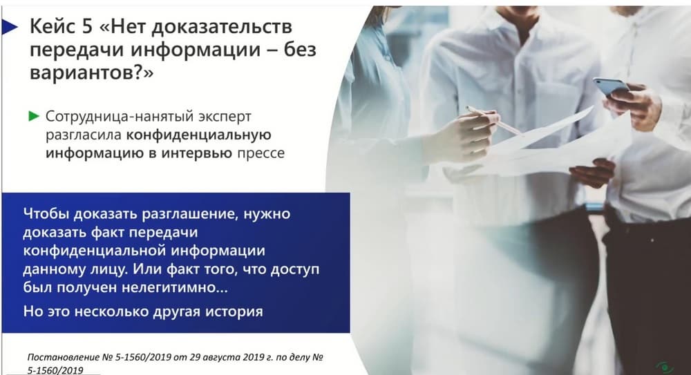 На слайде показан пример похожей ситуации. Адвокат разгласила ситуацию о тайне следствия, данный факт установлен, но есть нюанс, суду необходимо получить доказательства всей цепочки, т.е. не только самого факта разглашения, но было бы не плохо получить доказательства самого факта передачи информации. Это дело административное, но тем не менее, оно очень интересное в смысле того, что налицо факт разглашения (адвокат был на допросе и получил эту информацию), но для суда было неочевидно, что состоялась передача информации. Факт разглашения суд счел доказанным, а вот факта передачи информации не было. Так же в приведенном примере про маркетолога нет доказательств факта передачи.