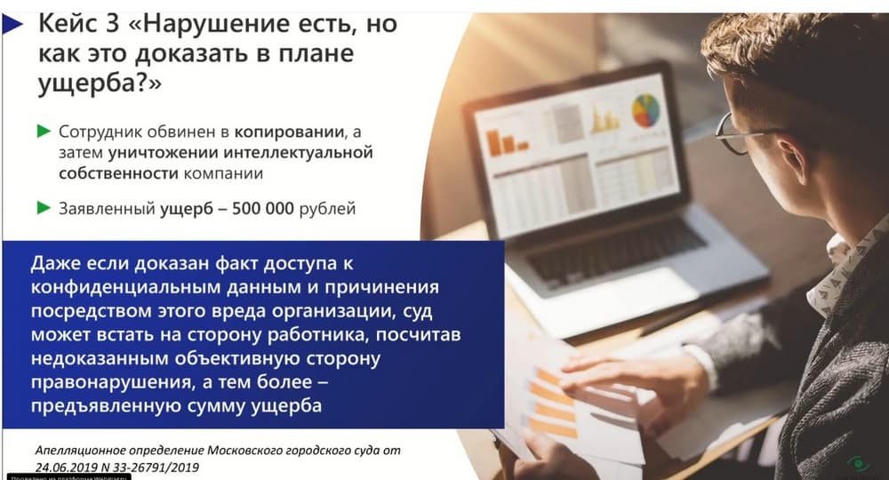 Когда мы говорим об ущербе и каких-то деньгах, которые должны быть востребованы с сотрудника за разглашение, мы должны понимать, что в этом случае нам придется доказать весь состав ущерба. Суды в этом случае спрашивают, вы хотите денег, противоправность вы показали, объясните тогда весь остальной состав ущерба. Докажите вину сотрудника, был ли это умысел или была небрежность, либо еще что-то. Объясните причинно-следственную связь и аргументируйте саму сумму ущерба.