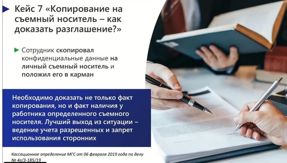 Как правило доказывают сам факт передачи информации на съемный носитель логами системы и суду это не всегда понятно.