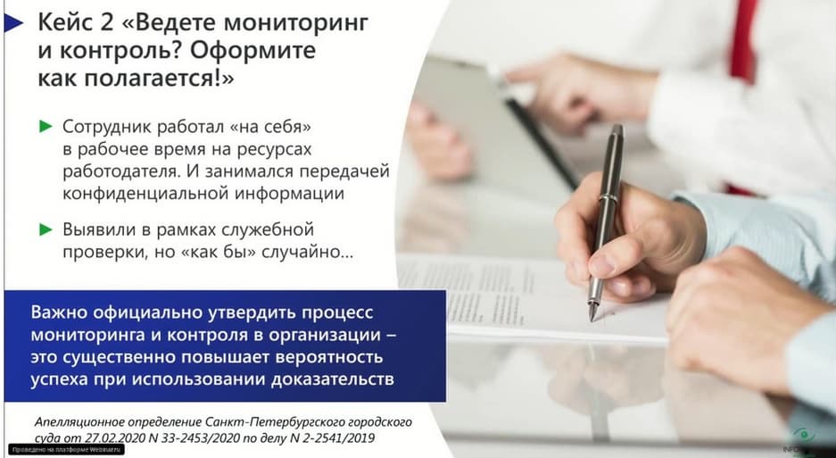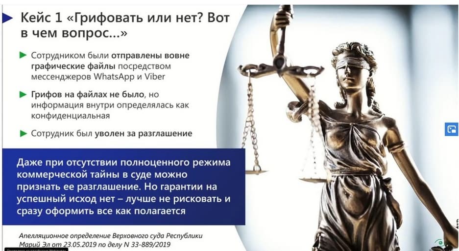 Тем не менее, данные доказательства в виде служебной записки были предоставлены в суде, по решению суда данные доказательства в деле остались, но особого доверия у суда они не вызвали. Суд выкрутился следующим образом: нет грифов – нет режима. Тем не менее, в компании система мониторинга и контроля не была узаконена и было большой проблемой понять и объяснить суду откуда доказательства взялись.