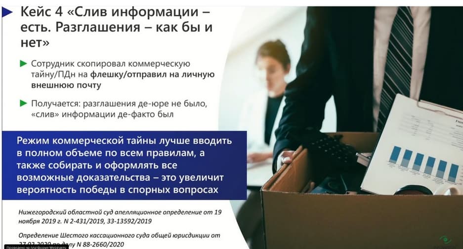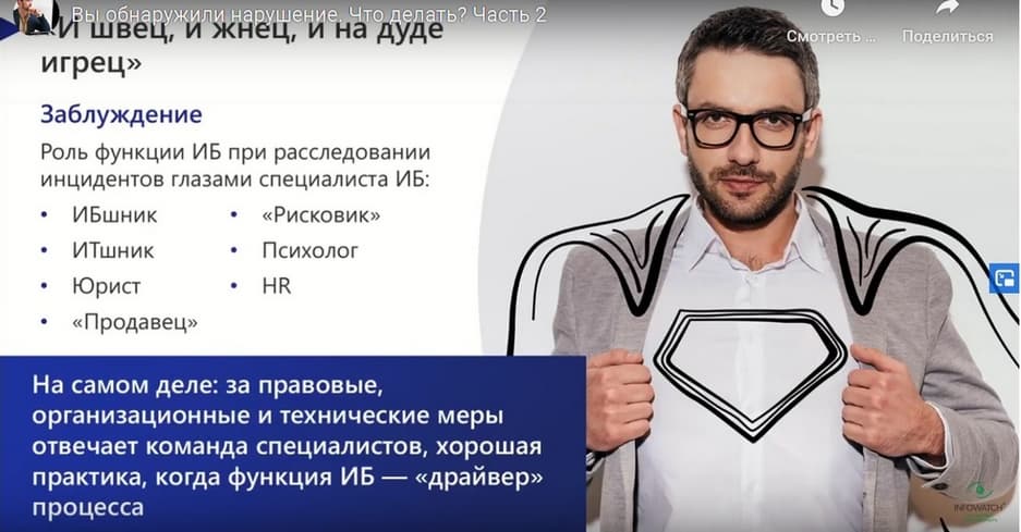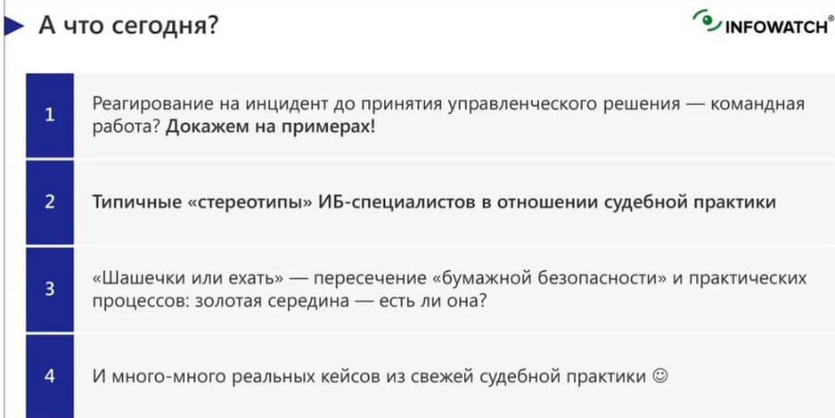 Сегодня будут разбираться случаи из судебной практики, относящиеся к сливу информации. Айтишники при реагировании на инциденты как правило берут на себя ИТ-функции, ИБ-функции, функции юристов и психологов, т.е. отвечают за все вопросы. Тем не менее важно плотно привлекать к этой работе и определенные подразделения компании.