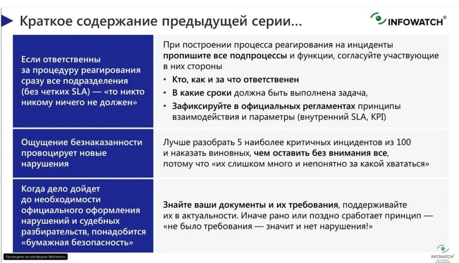 В компании InfoWatch возник спор, насколько важен строгий режим, важно грифование документов и выполнение множества пунктов, которые с точки зрения практики ИБ-безопасности абсолютно невыполнимы. Что важно учесть, когда речь идет о реагировании на инциденты и доведение до принятия управленческого решения.