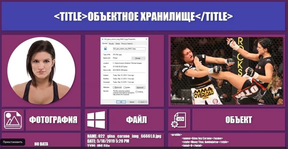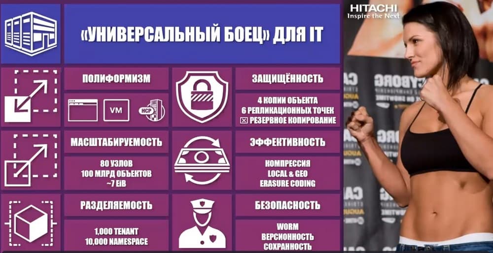 Однако, если к файлу добавить дополнительно свои особенные метаданные, написать, например, что девушку зовут Джина, что она профессионально занимается единоборствами, что у нее на данный момент 8 боев и 7 побед, то тогда, даже не заходя в этот документ, вы сможете его найти, выделив его из общей массы, понять, что в нем находится, и нужен ли он вам для каких-то целей или нет. То есть дать ему персонализацию. Соответственно, файл плюс его собственные метаданные - это в нашей терминологии и называется объектом. Т.о. Hitachi Content Platform является именно объектной системой хранения. Она позволяет добавлять и работать своему функционалу с дополнительными метаданными к каждому файлу, который она хранит.