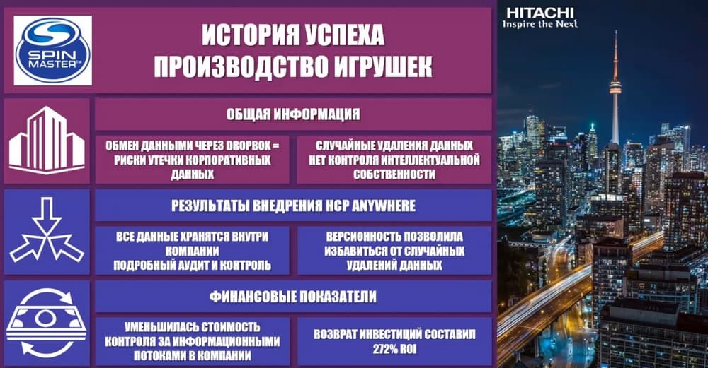 Теперь пример использования. Канадская компания Spin Master производит огромное количество игрушек для детей и подростков. У них была проблема. Их сотрудники обменивались данными через Drobox. Это было чревато тем, что корпоративные данные уходили непонятно куда. Служба безопасности очень переживала по этому поводу. Потому что там зачастую была интеллектуальная собственность, которая иногда пропадала. И второй проблемой было то, что пользователи могли удалить или изменить информацию, хотя не хотели этого делать, а сделали это случайно. Они шли в IT-службу своей компании, а те разводили руками, говорили, что у вас всё лежит в Drobox, и мы ничего сделать не можем. Когда они перевели все на HCP Anywhere, у сотрудников остался прежний инструмент, к которому они привыкли, с тем же функционалом, но при этом вся информация стала лежать внутри компании, все всегда знали, кто куда зашел, что положил, что отправил. И помимо этого за счёт поддержки версионности на HCP это позволило уйти от этих случайных удалений и изменений файлов. Потому что в HCP Anywhere прямо из дашборда пользователь может сам смотреть свои старые версии документов. Количество их и время хранения задает администратор. И в случае, если он что-то случайно изменил или удалил, он может вернуть обратно в определенный срок, не беспокоя IT-службу.