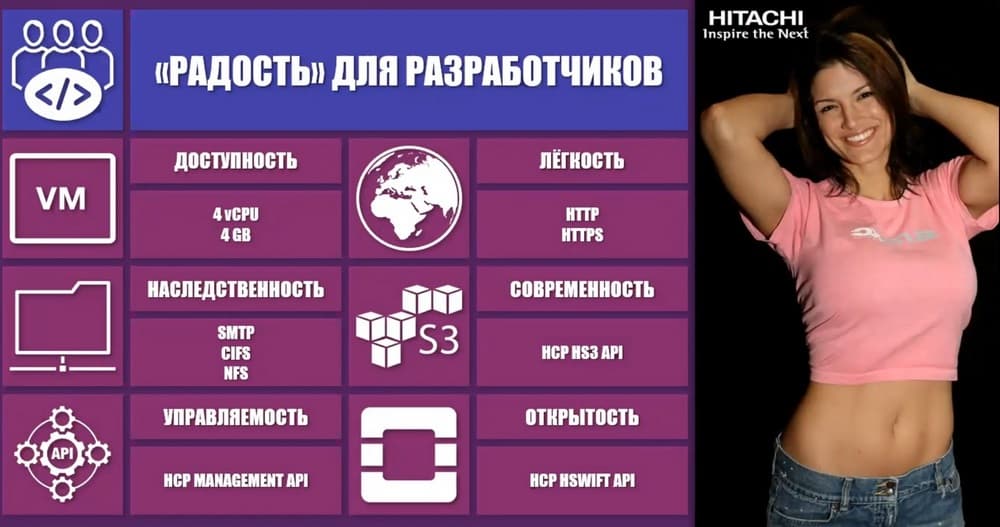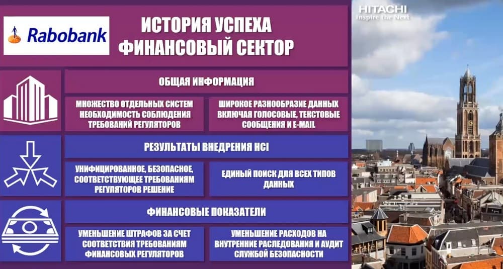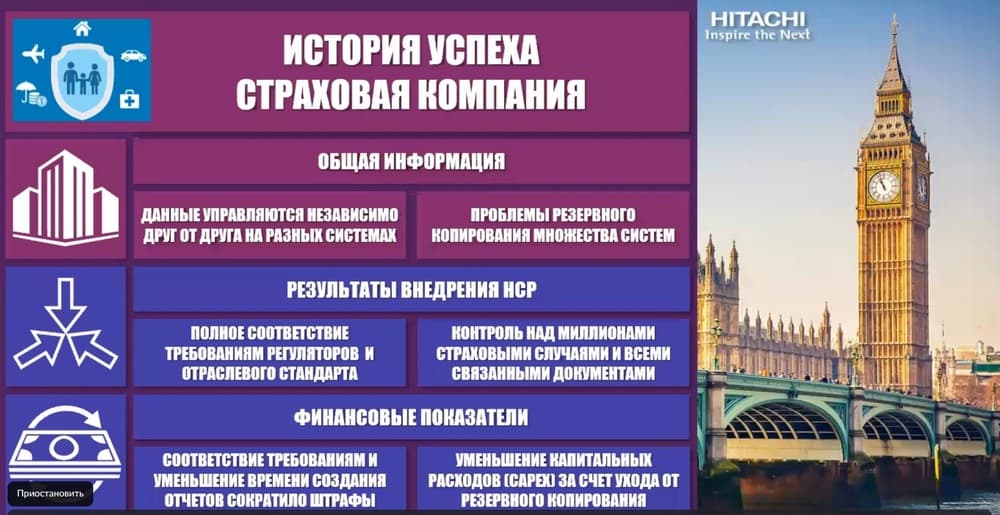 Здесь история успеха одной из крупных британских страховых компаний. Она покупала более мелкие компании и делала эти слияния со всей IT-структурой купленных компаний. В результате в новой общей инфраструктуре образовался зоопарк. Совместно существовало множество самых разных систем, доставшихся от прежних хозяев. Всех их нужно отдельно обслуживать, отдельно резервировать. А этот процесс стоит достаточно дорого. Резервное копирование никогда не было дешевым удовольствием. При этом в последние годы требования регуляторов заметно усложнились. Но, однако, пока ты обежишь все эти системы, пока соберешь необходимые данные, пока сравнишь, где они корректные, а где нет, время уходило, страховая компания получала значительные штрафы от регуляторов. Особенно, если штраф зависит от годовой выручки. Тогда они решили обратиться в Hitachi. Мы им показали решение НCP. У нас есть решение, которое позволяет переносить данные с более старых систем. Они перенесли всё на НCP, теперь все данные они получают из одного источника. Им теперь легко найти информацию для регуляторов. И за счет того, что они полностью ушли от резервного копирования, было сэкономлено огромное количество ресурсов для дальнейшего развития и IT-менеджмента.