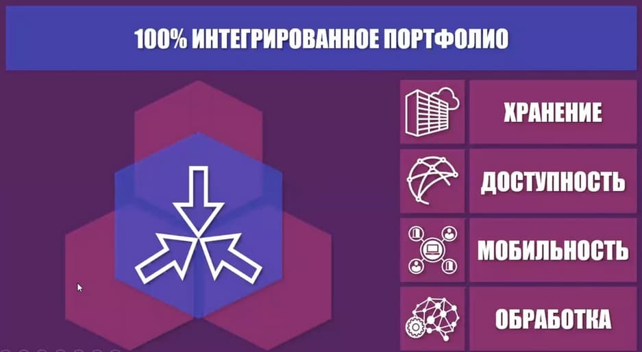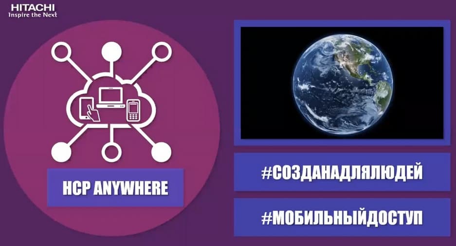 Достоинство такого рабочего места Hitachi еще и в том, что вся информация, вся документация клиента, которая обычно хранилась на его рабочем ноутбуке, все чаще переходит в облачные хранилища, доступ к этой информации должен быть быстрым с любого устройства в любой момент времени. Для этого у компании Hitachi есть Hitachi Content Portfolio (HCP) и состоит оно из четырех основных продуктов. Hitachi Content Platform - система хранения, два продукта, которые созданы для увеличения его функционала в плане мобильности и доступности: HCP Anywhere и HCP Gateway. И отдельный продукт HCP Intelligence, который осуществляет аналитику и обработку файловых и объектных данных.