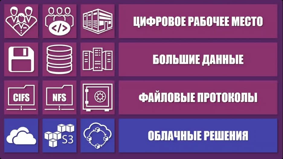 В современных условиях эти инфраструктуры развиваются достаточно быстро. И особенно существенные изменения произошли в последние 5-10 лет. Растут требования к IT-инфраструктуре как у пользователей, так и у разработчиков. И не всегда традиционные системы способны с этим справиться. Под традиционными имеются ввиду блочные и файловые хранилища. Многие разработчики сейчас работают в облачном направлении, используя S3-технологии и т.п., а они требуют иных решений. Современное цифровое рабочее место должно получать информацию, иметь возможность обмениваться ею в любой момент времени через Интернет, при этом подключаясь к каким-то отдельным внутренним контурам. Тут есть проблема, которая в последнее время набирает обороты, это большие базы данных. Сейчас все быстрее увеличивается объем данных и их количество растет лавинообразно. И чем больше таких данных, тем сложнее файловым системам с этим справляться.